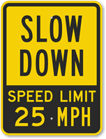 Our 25 MPH signs are available in a variety of different sizes, colors and reflectivities. Choose from one of the designs below.