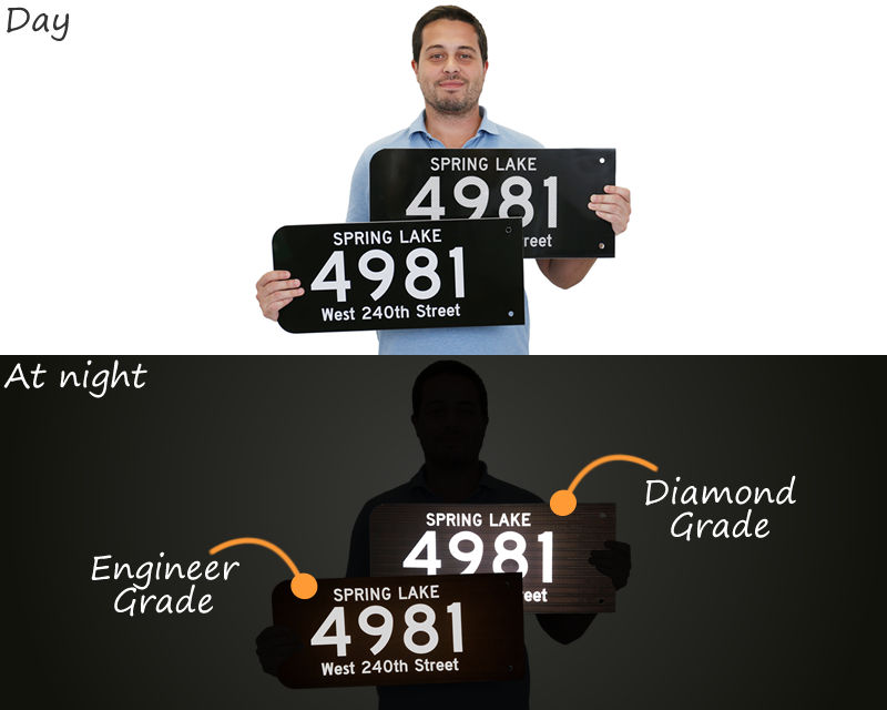 Diamond grade reflective address signs offer ten times the reflectivity of Engineer grade signs and come with an outdoor life of at least 12 years. These signs combine high daytime conspicuity with superior nighttime reflectivity. They also have wide-angle reflective performance due to which the text can be read from any angle, even in the dark. Diamond grade signs are the best choice for places with a lot of visual distractions like the busy streets.