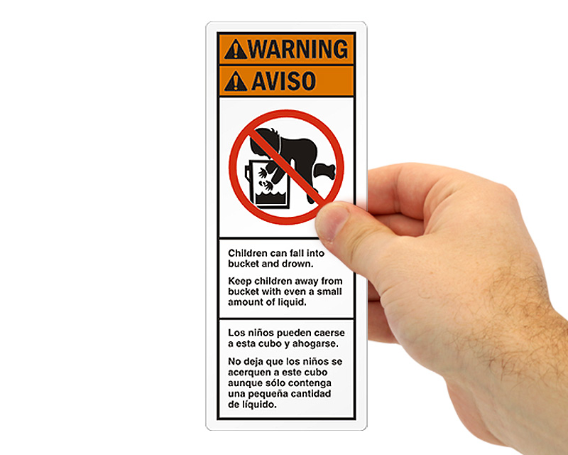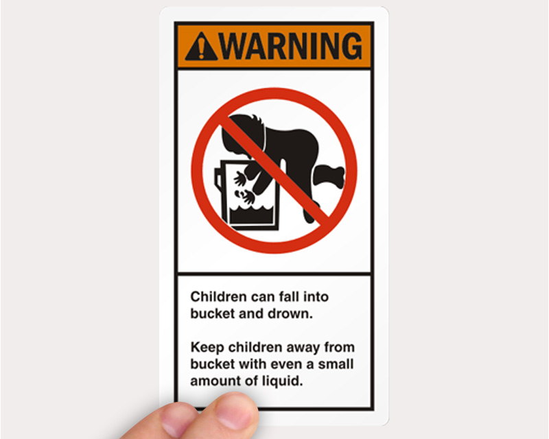 Drowning is the leading cause of death among children aged one to four. Therefore, California government passed a law stating that labels depicting a baby falling into a bucket must be placed on opposite sides of any four to six gallon open head pails and containers. We offer the lowest prices on these Baby in the Bucket Labels! Warn parents and guardians and prevent any negligent behavior towards kids.