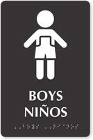 These signs are primarily used in schools, daycare centers, and youth organizations to clearly designate gender-specific facilities for children. A Boys restroom sign helps maintain order in high-traffic hallways and ensures younger students can easily identify the correct facility. These are a standard part of our school signs collection.