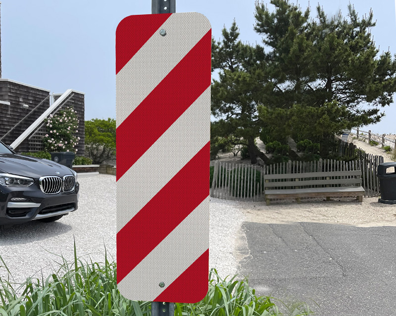 A striking way to keep your drivers safe, chevron signs show the edge of the road, dangerous curves, or other hazards. Chevrons are most often used on the outside of a curve or the narrowing of a road. For the striped designs, the stripes should point down – to indicate the direction for the traffic to pass an obstruction.