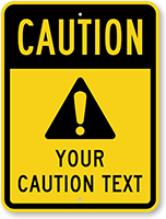 A custom caution sign uses the standard yellow OSHA/ANSI caution header but allows you to write your own text. It is used for hazards that could cause minor injury or to warn against unsafe practices. You can design one using our custom signs tool.