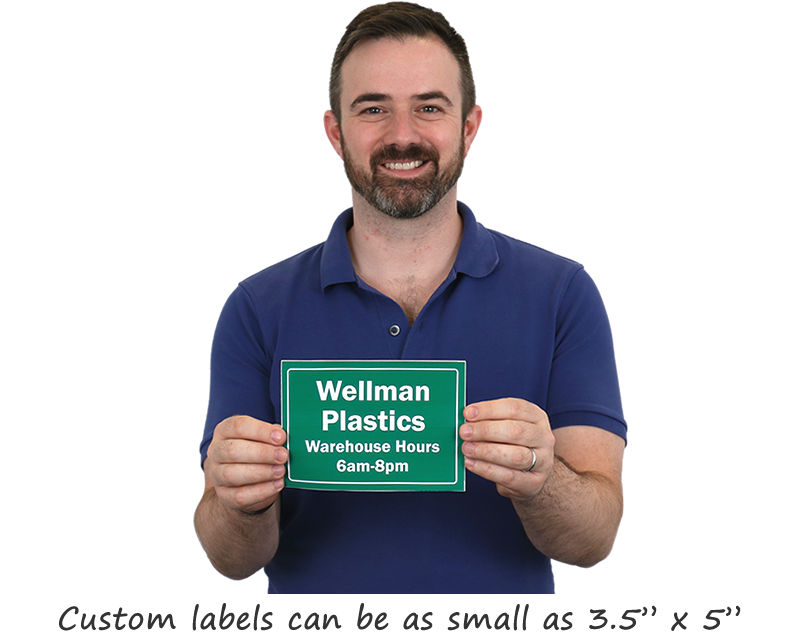 Our custom industrial signs are available in sizes ranging from a compact 3.5x5 inch label up to a large 48x60 inch banner-size sign, letting you select the exact dimensions required for your specific installation location whether you need a small equipment label or a large aisle-facing warning sign.