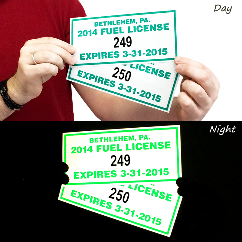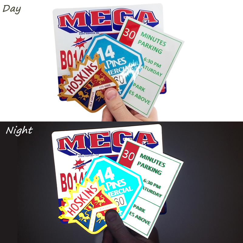 Premium 3M reflective materials and matched component inks, the same used for traffic and street signs.