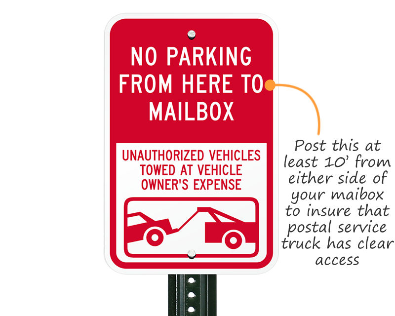 • • Rules may change by neighborhood, but, generally, signs should be posted about 10’ from each side of the mailbox to give the postal service vehicle clear access.