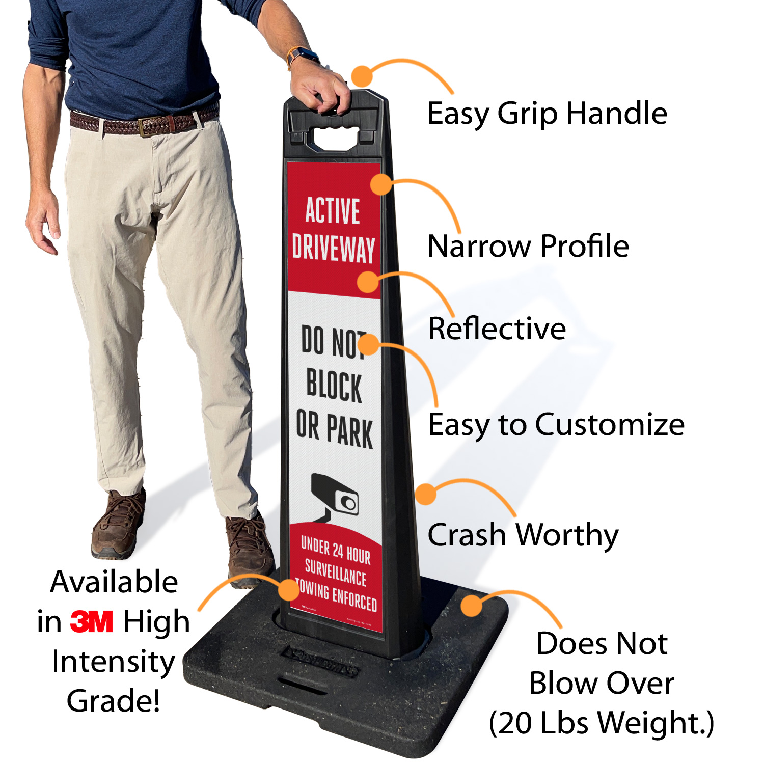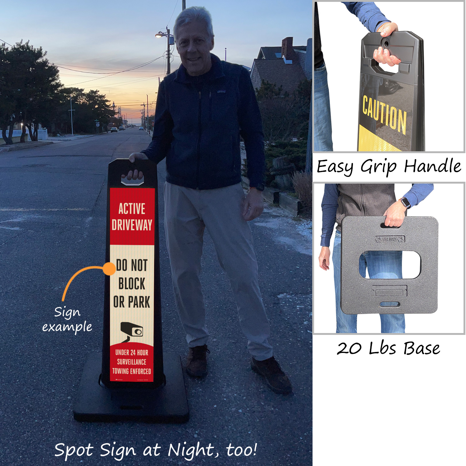 Sign panel and base are stackable for compact storage.