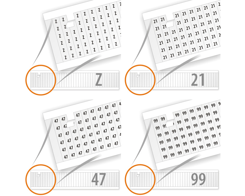 Solid wire marker cards are pocket-sized cards that contain rows of pre-printed, self-adhesive labels. These labels feature solid, single numbers (0-9) or letters (A-Z) and are used to identify and organize individual wires and cables.