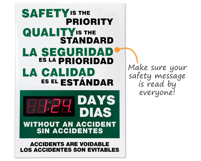 Speak to a bigger audience with Bilingual Safety Scoreboards. With a vital safety message in both English and Spanish, you can communicate your safety program and measure its success with one board. Using the same energy saving LED counter as our other popular signs, these bilingual safety scoreboard signs are sure to be a bright addition to your organization.