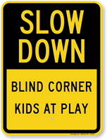 Slow down! Blind corner is ahead. Blind corners exist because of a curve, landscaping, parking cars or a hill. In all cases, a blind corner sign gives everyone advanced warning of the potential for a vehicle to suddenly appear.