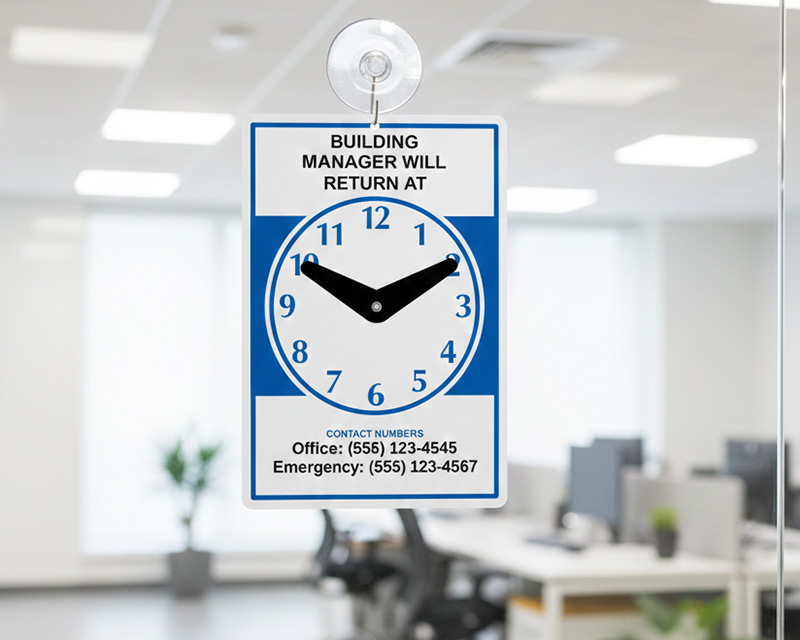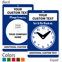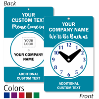 Adjustable clock signs feature moveable hands or sliding markers that indicate opening/closing times or return times, with some including separate weekday/weekend displays or multiple clock faces for complex schedules. Check out our be back clock signs video for an example.
