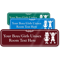 • • Choose from custom signs for men’s, women’s, boys, girls, unisex, and family restrooms – just add text, adjust the font, and choose a color.