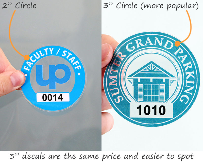 Our custom circle parking stickers are available in over ten different material options, including static cling, reflective, and durable laminated choices. This wide variety ensures you can select the ideal material for indoor, outdoor, or specialty applications, providing long-lasting visibility and security for your parking permits. Review all options on the parking permit stickers by shape page.