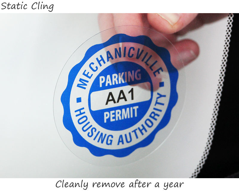 A static cling circular parking sticker is an adhesive-free decal that sticks to windows using static electricity. perfect for temporary or short-term parking permits, it is easy to apply, remove, and reuse without leaving any sticky residue, making it convenient and mess-free for vehicle identification. This is a great choice for temporary parking passes.