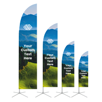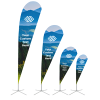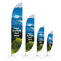 Standard feather flags range from 8-foot (indoor/sidewalk) to 12-foot (storefronts) and 15-foot (car lots/events), with flag portion measuring 24-36 inches wide maintaining visibility without excessive wind resistance. We also offer teardrop flags.