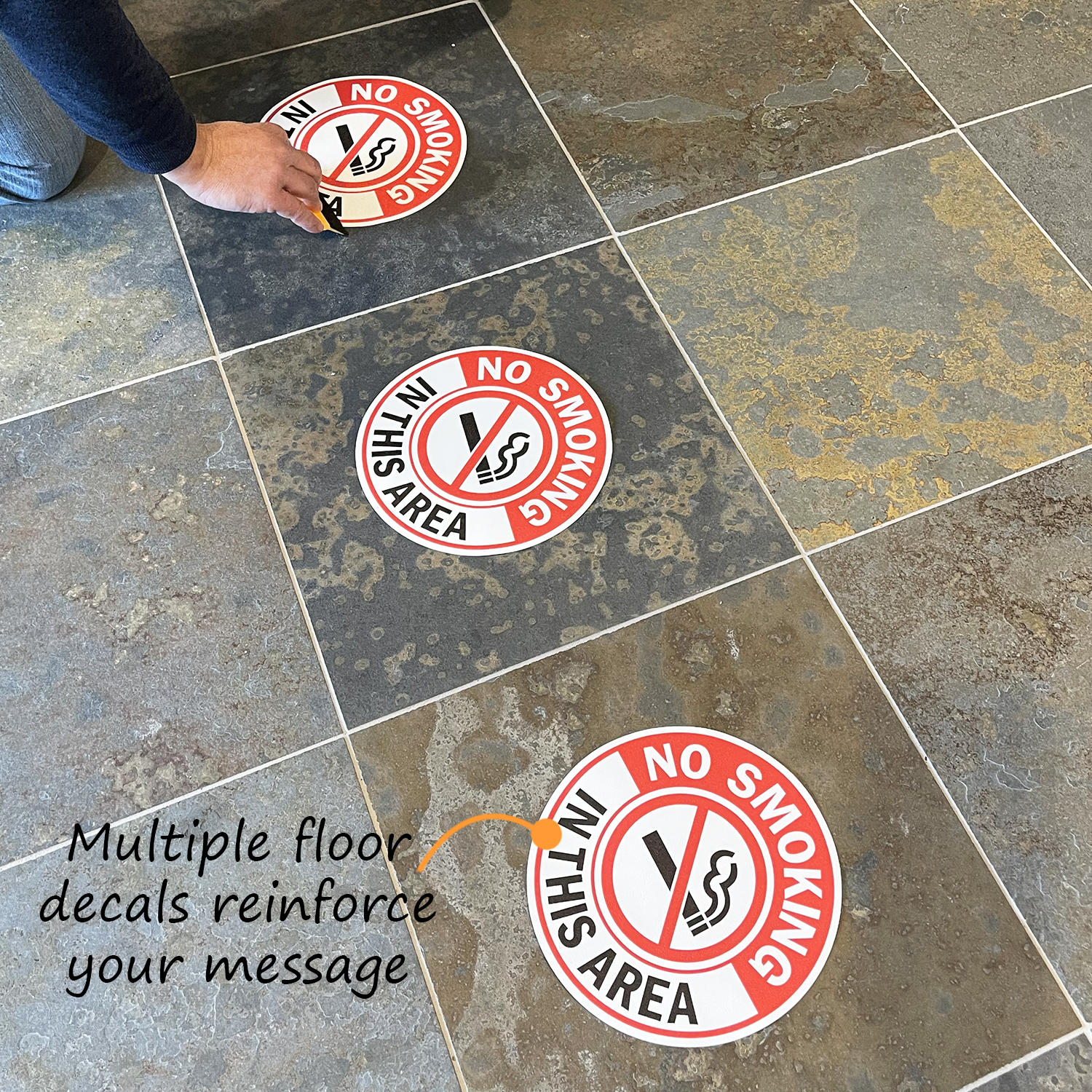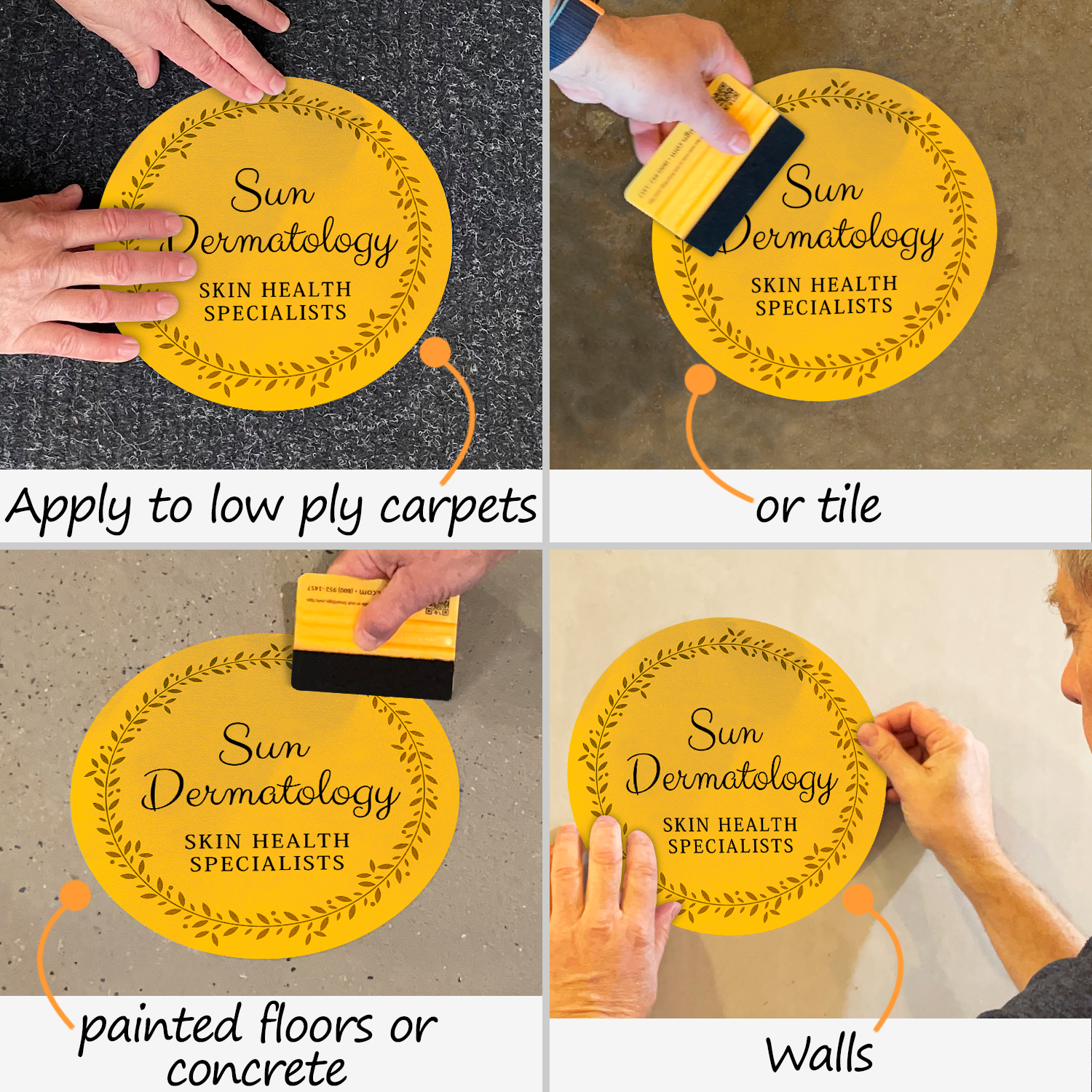 Custom floor signs come with strong adhesive backing and are extremely easy to install. These are most suited for smooth floors and can be applied to low-ply commercial carpets as well. All that you have to do is clean the surface and apply your decal. Floor decal materials are best suited for smooth surfaces, although SlipSafe heavy-duty and AlumiGrip can be used on textured, hard surfaces as well.
