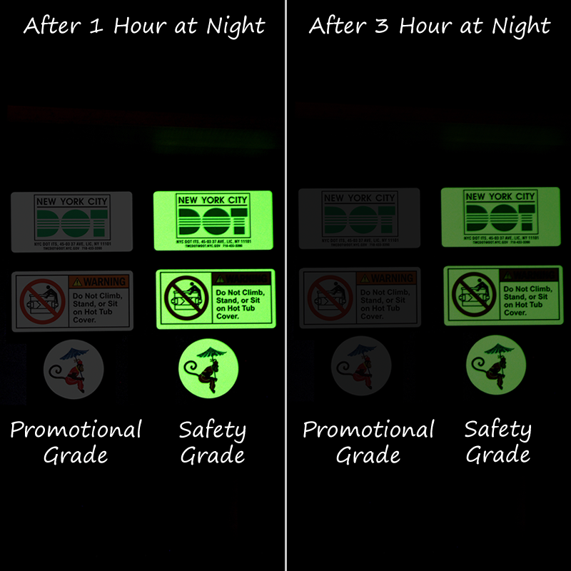 Find two grades of glow-in-the dark material: economical Promotional Grade and premium Safety Grade, which surpasses NYC and ASTM standards.