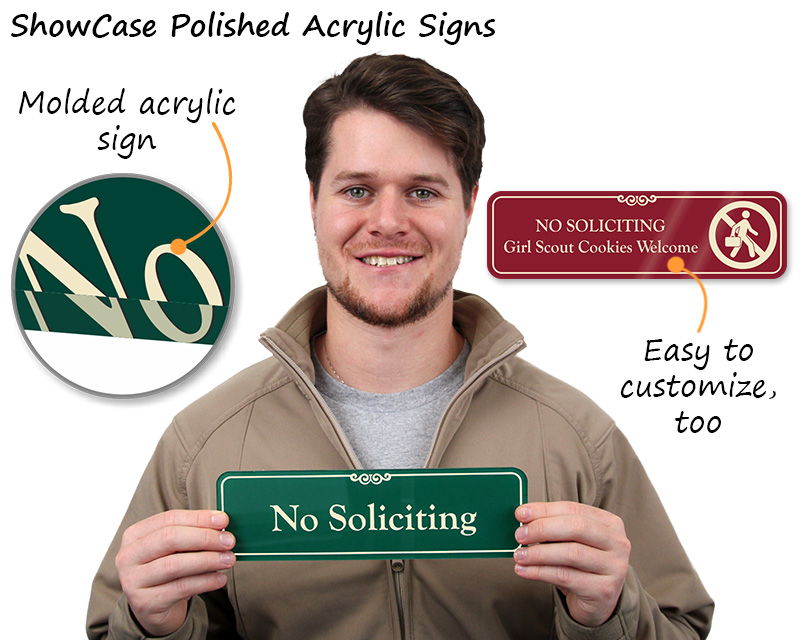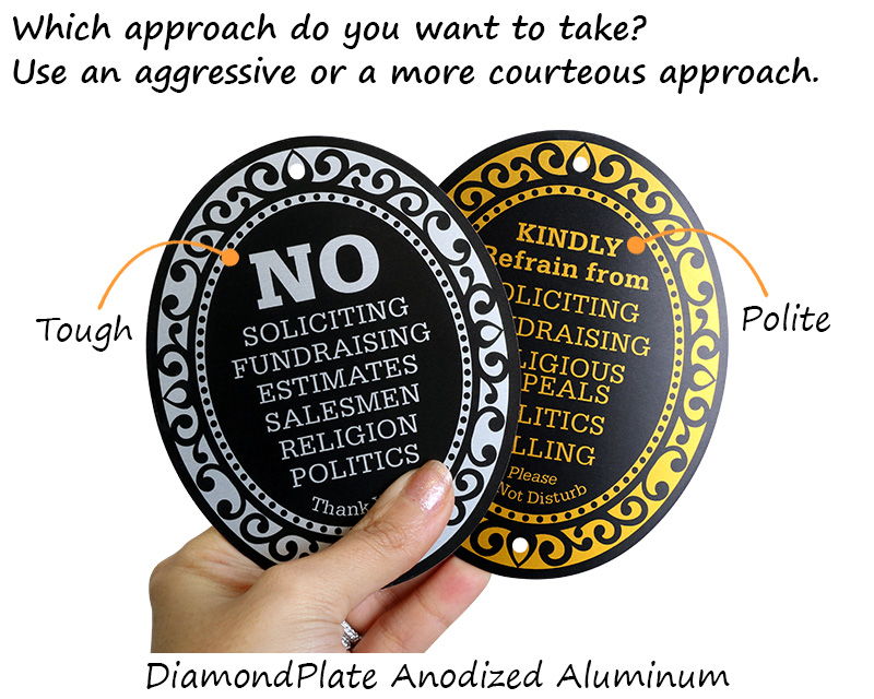 You can choose from a variety of signs designed professionally to suit houses and residences. Our DiamondPlate and ShowCase no soliciting signs present a rather elegant way to keep solicitors away. Designed to complement different decors and styles, these signs stand out and last a long time. Our ShowCase signs are available in different colors.