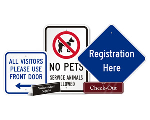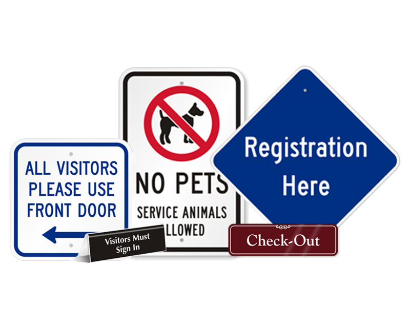 • • Includes Visitor Entry, Reception, and Check-In/Check-Out signs