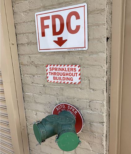 IBC [Section 912.5] requires a metal sign with raised letters not less than 1 inch on all FDCs connected to automatic sprinklers, standpipes, or fire pump connections. The sign shall read AUTOMATIC SPRINKLERS or STANDPIPES or TEST CONNECTION or a combination of thereof to tell firefighters where the water goes—to a fire sprinkler system, standpipe system, or both.