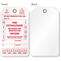 Recharge, record, repeat. Local fire codes require that you have a legitimate record of fire extinguisher recharge every year, or a valid, dated receipt if new extinguishers are purchased. If you have a number of extinguishers that are recharged yearly, get the job done with the most comprehensive Fire Extinguisher Recharge Tags in the business. With sturdy reinforced eyelets, rugged, fire-resistant materials and a debossable surface, you can have the toughest tag that makes your recharge records a snap to update. From write-on vinyl to debossable aluminum, we have the right tag for the job. For faster tagging on multiple fire extinguishers, grab our Tag-in-a-Box tag set in a convenient dispenser for better storage and quicker tagging. Don't let your recharge record fall behind - comply with stringent fire codes and promote regular fire extinguisher recharge with a tag that works for you.