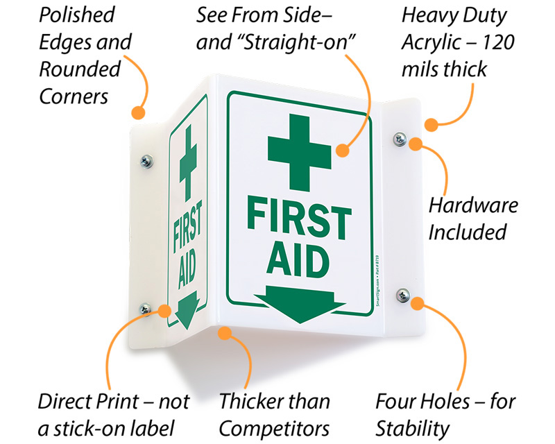 Mount first aid signs directly above the kit, cabinet, or station to ensure immediate visibility, as kits are often small and hard to spot. For large facilities, place directional signs at hallway ends to guide people clearly. Ensure signs are mounted above eye level and remain free of obstructions for quick emergency access.