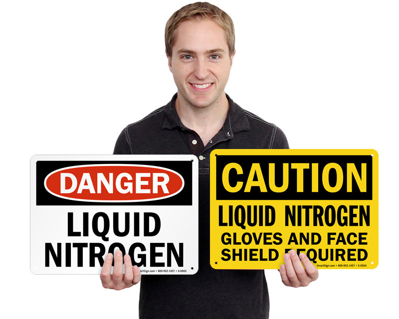 Liquid nitrogen warning signs must address three primary hazards: extreme cold that causes severe cryogenic burns on contact, rapid gas expansion that can displace oxygen and create asphyxiation risk in enclosed spaces, and pressure buildup in sealed containers that can cause explosive rupture. Our liquid nitrogen signs cover all three hazards in OSHA and ANSI-compliant Danger and Warning formats.