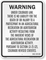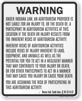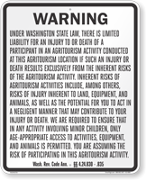 Agritourism and equine liability signs both follow state-specific statutory language but may differ in required wording and dimensions depending on the type of activity covered, and our agritourism liability signs and equine liability signs are each carefully crafted to meet the specific requirements of individual state laws governing farm and equine activities.