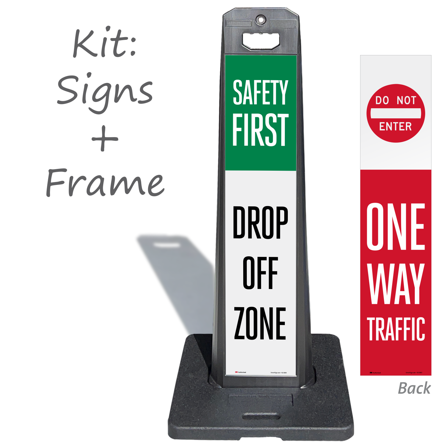 Sign panel and base are stackable for compact storage.