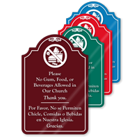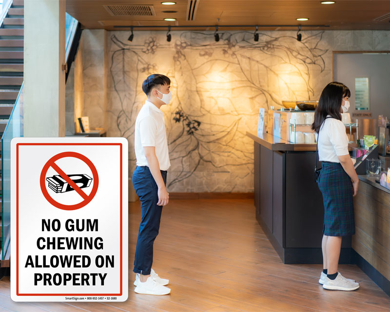 We carry no chewing gum signs for food processing plants, pharmaceutical cleanrooms, medical device manufacturing areas, and commercial food service operations where chewing gum poses a contamination risk. Signs are available in aluminum, plastic, and adhesive vinyl - with bilingual English/Spanish options and pictogram designs for facilities with diverse multilingual workforces.