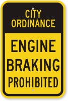No engine braking signs are used because compression-release brakes can generate noise levels above 100 decibels. Communities restrict engine braking near residential neighborhoods and downtowns to reduce noise pollution and maintain peaceful environments. See the engine braking prohibited city ordinance sign for an example used in local ordinances.
