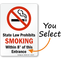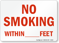 Use our advanced custom wizard to create your own No Smoking Within Feet Signs. Many states prohibit smoking within some feet of an entrance to a building and exit doors. Our custom sign templates make it easy for you to create a customized sign in just minutes!