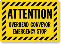 Remind people to be aware, even what's above their heads. Overhead Conveyor Signs alert people to conveyor belts above their heads.
