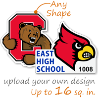 - • Find at the bottom our custom die-cut shape options. Select up to 4 sq in, 9 sq in or 16 sq in size and we'll cut out any shape for you. Perfect for showing off your logo or school mascot!