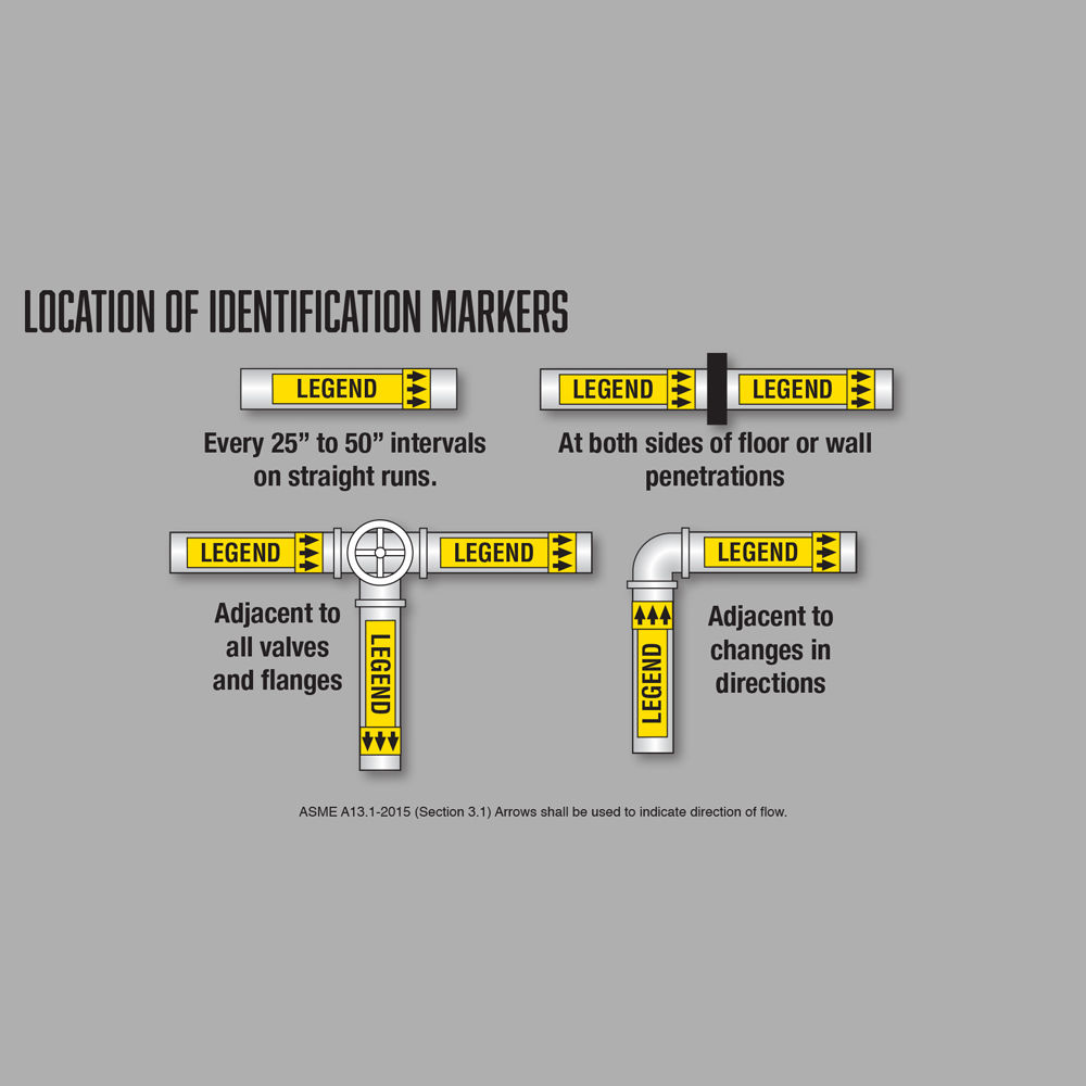 ANSI/ASME A13.1 is the industry standard for pipe marking. It specifies the color codes (e.g., Yellow/Black for flammable, Green/White for potable water), label sizes, and text height required for different pipe contents.