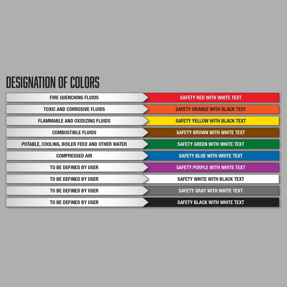 Our pipe markers feature a permanent adhesive backing and thick clear UV, abrasion and fade resistant coating. Markers adhere to a wide variety of smooth, clean surfaces. All colors meet the ANSI 535.1 and Z535.1 Safety Color Chart and comply with ANSI/ASME A13.1-2015. Must be used in conjunction with a flow direction indicator for full compliance. We recommend the use of our Directional Flow Arrow Tape.