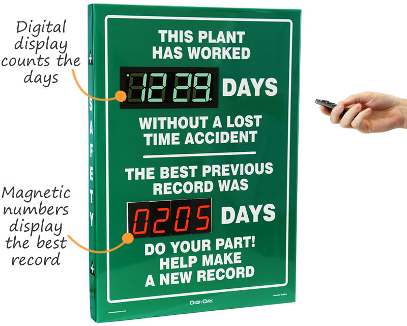 Encourage employees to beat their previous safety record. Turn safety into a fun competition in your factory or warehouse. We made our fun and compelling safety scoreboards engaging because safety should be the primary goal of every company. Invest in your orgnization's safety with a hard to miss Previous Record Safety Scoreboard!