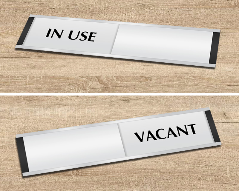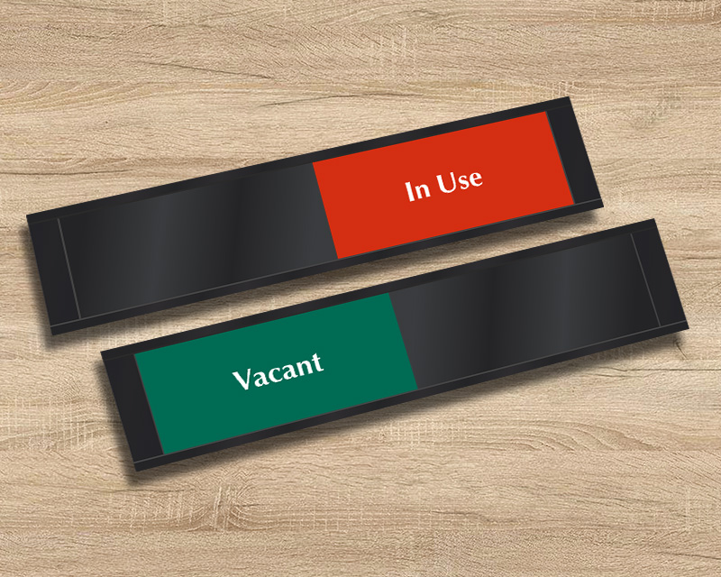 The term “vacant” indicates physical emptiness, such as restrooms or storage areas, while “available” suggests readiness for service or meetings. You can explore both options in our in-use/vacant slider signs and room in-use signs collection. For offices or medical settings, vacant occupied slider door signs communicate room status clearly and professionally.