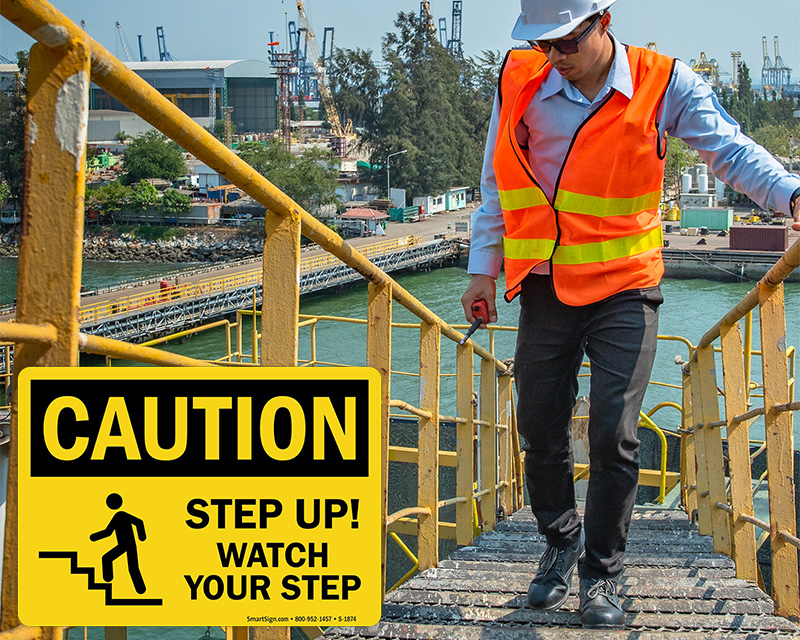 A step up sign specifically warns workers that a step elevation change is ahead and requires an upward foot movement - helping prevent the forward toe-catch trip hazard at the base of a step. A watch your step sign is a broader caution that alerts to a general slip, trip, or elevation change hazard. We carry both sign types in matching styles so facilities can use the most precise warning language at each specific elevation change location.