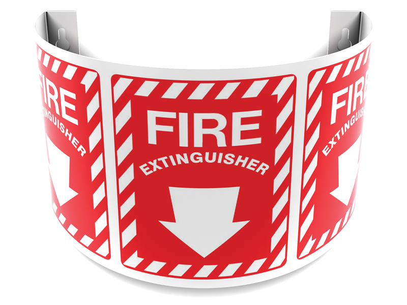 Flat wall signs can be viewed only from limited angles, but this 180 Degree Projecting Sign can be seen from multiple angles. The message 'Fire Extinguisher' is repeated three times and is can be viewed from the front and sides.