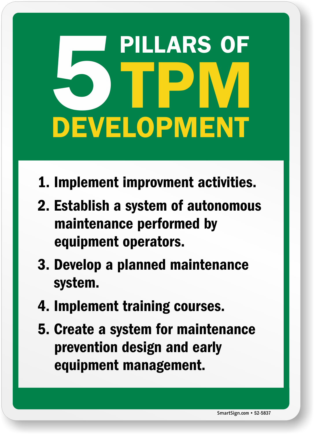 Strengthen TPM implementation with a 5 Pillars of TPM Development sign, ensuring a structured approach to maintenance.