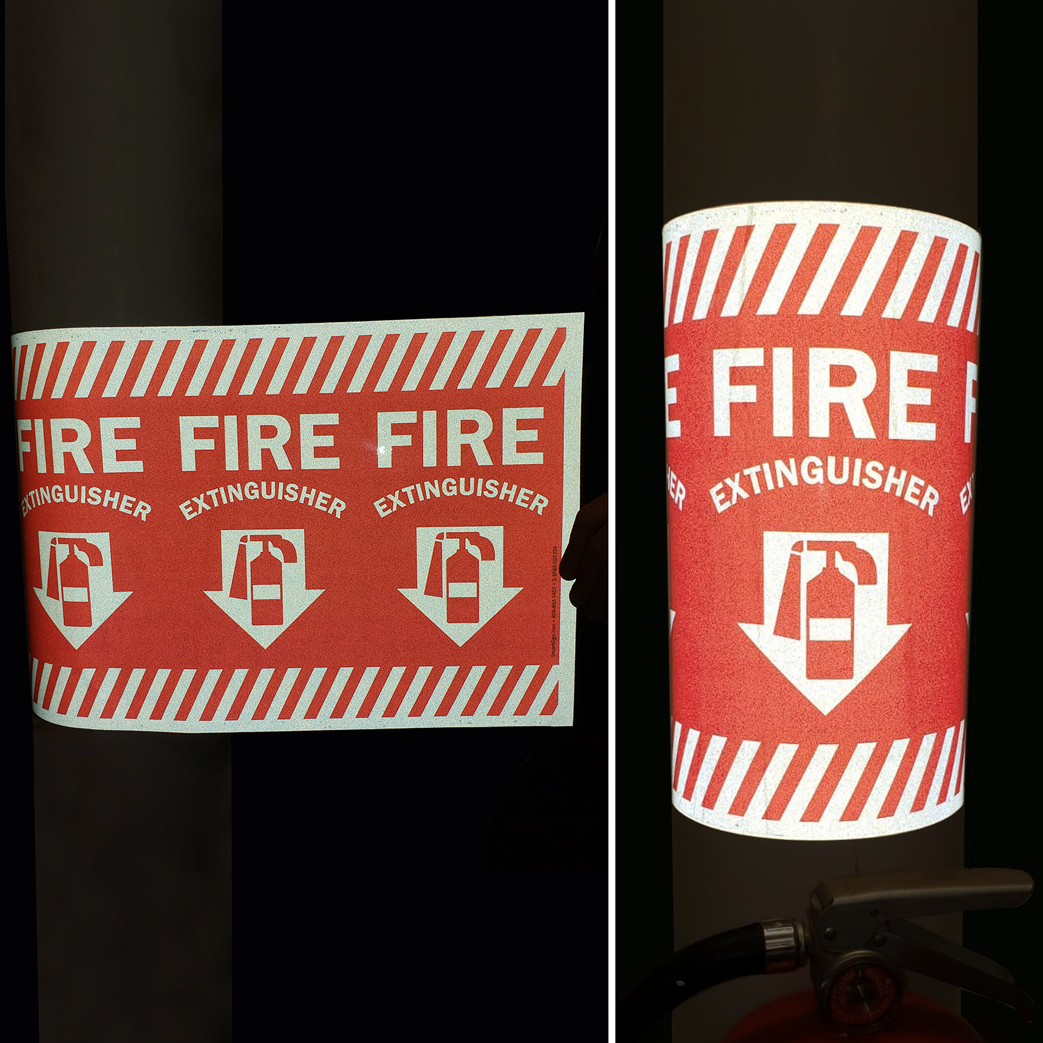 Make it easy to find the fire extinguisher, even in a blackout. These reflective signs stand out. Fire extinguisher sign wraps around a column. Provide 360 degree visibility to your fire extinguisher location. Durable, adhesive sign sticks firmly and wraps around to itself.