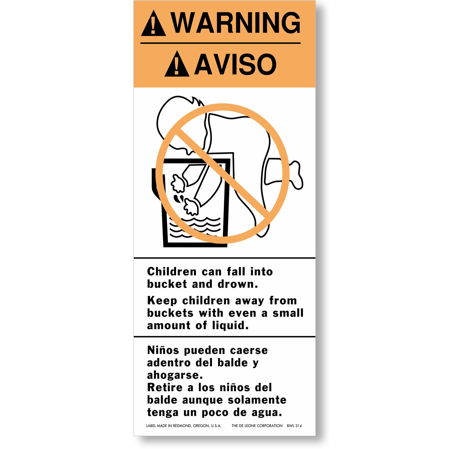 - ANSI warning labels encourage adults to empty filled buckets to prevent fatal accidents.