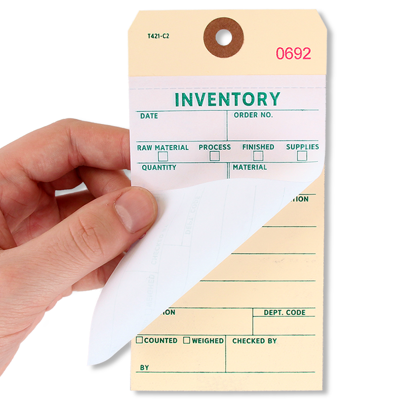 - This combo inventory tag has adhesive strip on the back of the tag that can be used to stick that tag to a flat surface. To expose the adhesive, just peel of the liner. For simple hanging applications, just leave the liner on.