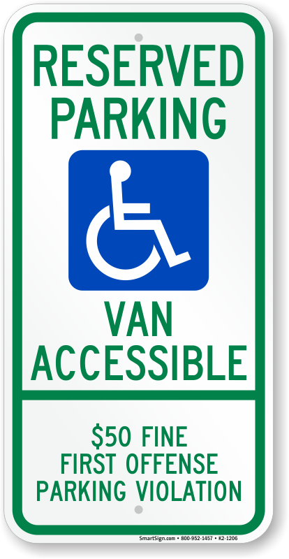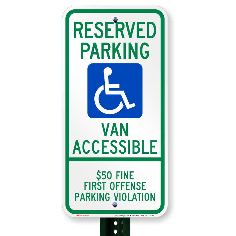 Alabama ADA Handicapped Parking Sign: Reserved Parking, Van Accessible, $50 Fine for First Offense Parking Violation with Symbol K2-1206 Learn More...
