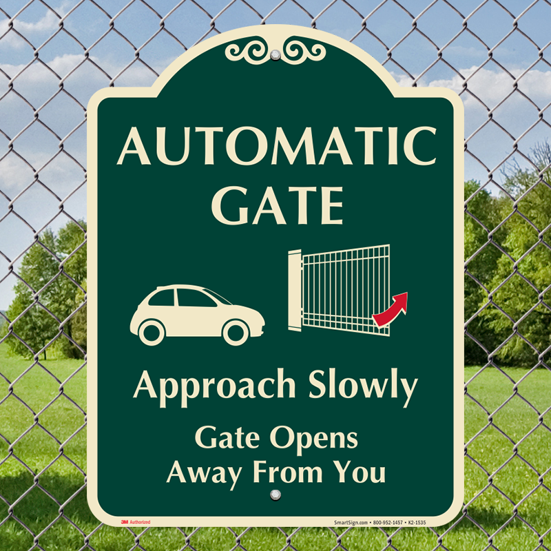 Use this signature sign to inform drivers that the automatic gate opens away from them and they should approach it slowly.