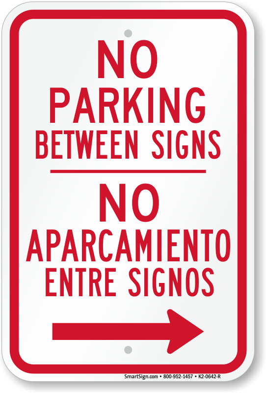 Bilingual No Parking Sign: No Parking Between Signs/No Aparcamiento Entre Signos with Right Arrow Learn More...
