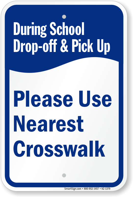 Pick-Up and Drop-Off Sign: During School Drop-Off and Pick-Up, Please Use Nearest Crosswalk K2-1379 Learn More...