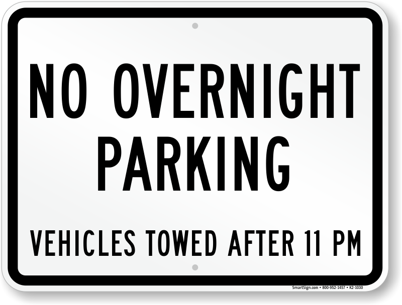 No Parking Sign: No Overnight Parking, Vehicles Towed After 11 PM Learn More...