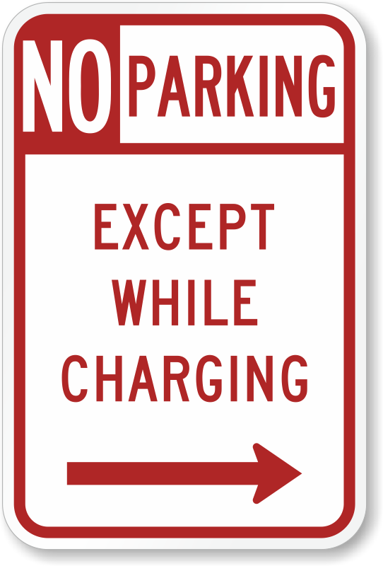 No Parking Sign: Except While Charging With Right Arrow Learn More...