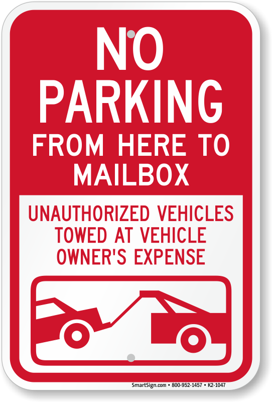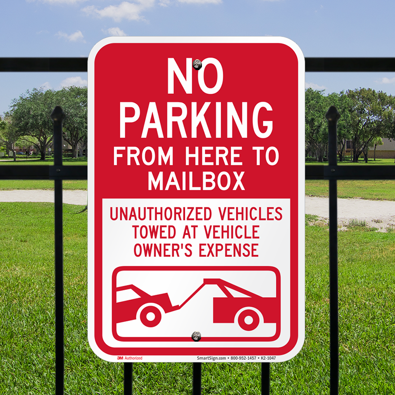 Parking Restriction Sign: No Parking From Here To Mailbox, Unauthorized Vehicles Towed At Owner Expense with Graphic K2-1047 Learn More...